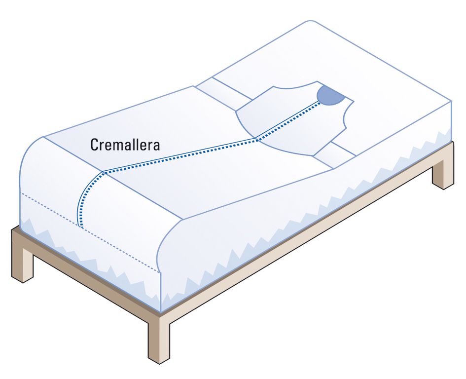Impedeix al pacient aixecar-se o caure del llit , així com manipular els empapadors, sondes etc. Permet seure al llit, girar-se i moure lliurement braços i cames. Fabricada en cotó 100% semiplàstic, per suportar estirades sense esquinçar-se. Cremallera reforçada amb tancament als peus i topall superior protegit del contacte de la pell. Goma d'ajust de tensió fort per subjectar el llençol sota el matalàs aprofitant el propi pes del pacient. Obertures laterals per permetre l'ús de sondes vesicals.